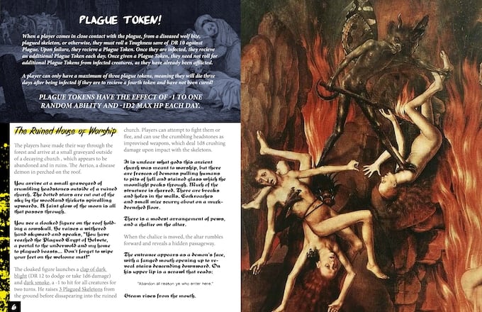 The Plagued Crypt of Helvete is a starting module which includes a market, mini-dungeon, new monsters and enemies, plagued beasts, and diseased demons. It's a three-act adventure which can be played altogether or in multiple sessions -- giving you everything you need to set the stage for a gruelingly grim and gnarly dark fantasy narrative.The module includes: three acts, which can be played in single or multiple sessions, a 3-page comic, diseased beasts and Plague Token system, a 36 piece random loot table, a 6 room mini-dungeon, as well as new enemies, items, and more!